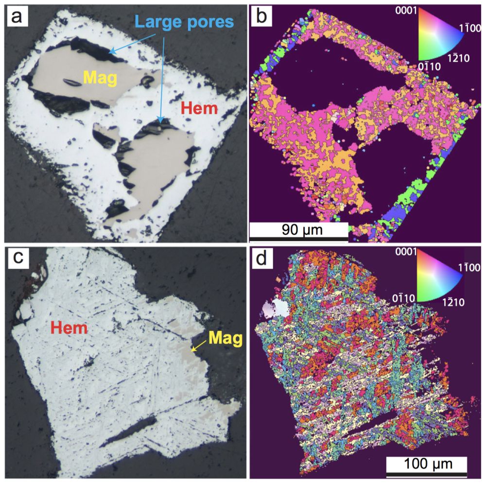 图3 在无氧溶液条件下,含Ce和不含Ce溶液中形成的磁铁矿-赤铁矿交代结构特征。(a-b)无氧化剂含Ce溶液形成的结构特征;(c-d)无氧化剂含Nd溶液形成的结构特征。a和c为光学反射光显微照片;b和d为电子背散射(EBSD)IPF取向图(Xing et al., 2021)