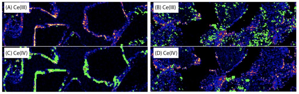 图4 不同价态Ce在产物中的分布 。(a、c)富氧溶液形成的产物;(b、d)无氧溶液形成的产物(见Xing et al., 2021附件)