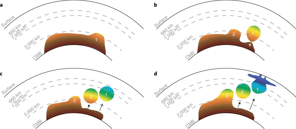 图4 印-非地幔柱树形结构的动力学成因模型(Tsekhmistrenko et al., 2021)。(a)CMB低速走廊及原始地幔柱(直径约为800 km的异常体1)。低速走廊末端具有最大的横向温度梯度,因此异常体1衍生于此;(b)异常体1与低速走廊分离,垂直上升并形成团状物1。最大横向温度梯度向左横移,导致异常体2重复异常体1的衍生过程;(c)同理,异常体2脱离形成团状物2,异常体3随之衍生;(d)示意图展示低速走廊的衍生异常体3与分离出的团状物1、2的倾斜线性排列及分离后减薄的CMB低速走廊。当团状物1达到上、下地幔黏性分界时,衍生出一套‘经典’的地幔柱头、柱尾结构。团状物1与图3中Reunion地幔柱相对应,而团状物3则与LLVP穹顶相对应