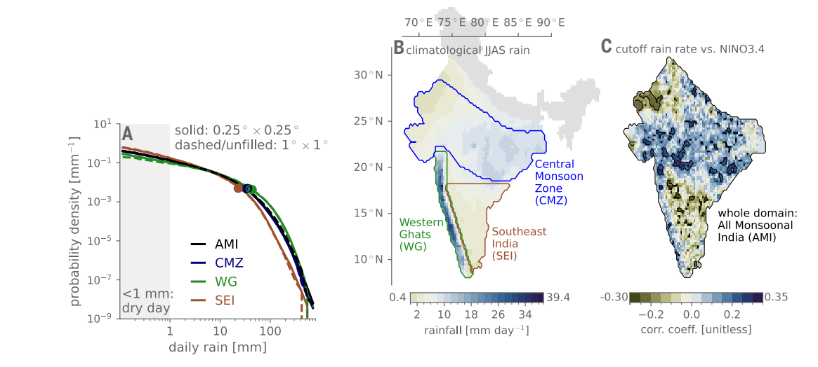 1 印度夏季风区最强降雨带的极端日降水在厄尔尼诺现象越强时越容易出现。(A) 1901–2020 6–9 月(JJAS)印度季风区格点日降雨量经验概率分布(对数–对数坐标):黑色线为整个印度季风区,蓝色为中部季风带,绿色为西高止山沿海带,棕色为东南印度(子区域范围见 (B)图)。图中实心圆表示气候学平均的 “cutoff” 雨量值,这是本文定义极端日降水的主要指标 (Hill et al., 2025, Martinez-Villalobos et al., 2019)(B) JJAS 平均降雨量的空间分布(单位:毫米/天)。北部和东北部被灰色遮盖的区域因数据质量问题而被排除在分析之外;(C) 去趋势后的 JJAS NINO3.4 序列与各格点 cutoff 雨量的皮尔逊相关系数。正值表示在厄尔尼诺条件下,相较于拉尼娜条件,极端降水更可能发生。黑色等值线圈出显著性检验区域,对应的显著性水平为 P<0.039