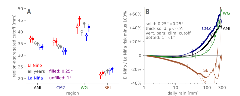 图2 厄尔尼诺夏季期间,轻度至中度降水累积概率在所有区域均受到抑制,而多雨区域的强降水和极端降水概率则增强。(A)填充圆圈表示各区域复合临界值(单位:毫米),空心圆圈为采用IMD 1°×1°数据集计算的结果;(B)ENSO风险比率:在限定降水日(>1毫米)条件下,厄尔尼诺复合事件中降雨量超过给定雨强的概率与拉尼娜复合事件的比值,以相对于1个百分比差值表示。粗线标示通过置换检验判定风险比率存在显著差异的区域。叠加的垂直线显示各区域的极端降雨临界值(cutoff),虚线为基于IMD 1°×1°数据集计算的风险比率