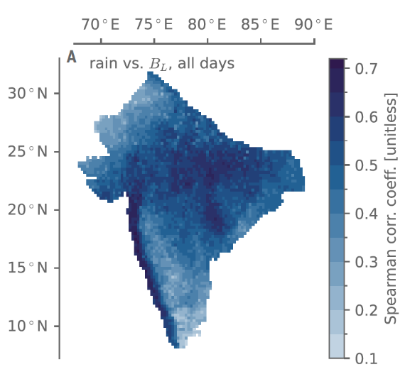 为解释这一看似反直觉的结果,研究团队引入了对流浮力(convective buoyancy)的机制分析。该团队结果表明日降雨量在很大程度上取决于局地对流浮力,两者间的非线性斯皮尔曼相关系数在各网格点均为正值(图3A),最高可达+0.71。各区域降雨量随局地浮力变化的条件平均值(图3B)和分位数(图3C)呈现出预期的准阈值关系(Ahmed et al.,2020):当浮力低于阈值前(略小于零),降雨通常微弱或不存在;超过该阈值后,降雨量急剧增加,并随之快速消耗浮力(图3B)。相较于干旱的印度东南部地区,多雨的西南沿海带和中央季风区的条件曲线呈现出更高的降雨量值。但对于印度整个季风区(AMI),这些曲线近似地表现为对ENSO状态不敏感(图3C)。
