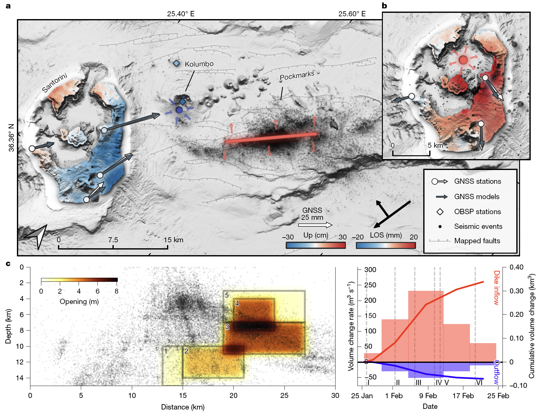 1 希腊圣托里尼及东部火山-断层带于2025年一月至二月的地震群和地表变形观测。Kolumbo的凹陷伴随断层带的隆升和地震群自西向东的迁移。为了解释断层带的隆升,作者假设了5期次岩墙膨胀。模拟结果显示岩墙膨胀增量是Kolumbo岩浆房收缩量的4倍(Isken et al., 2025
