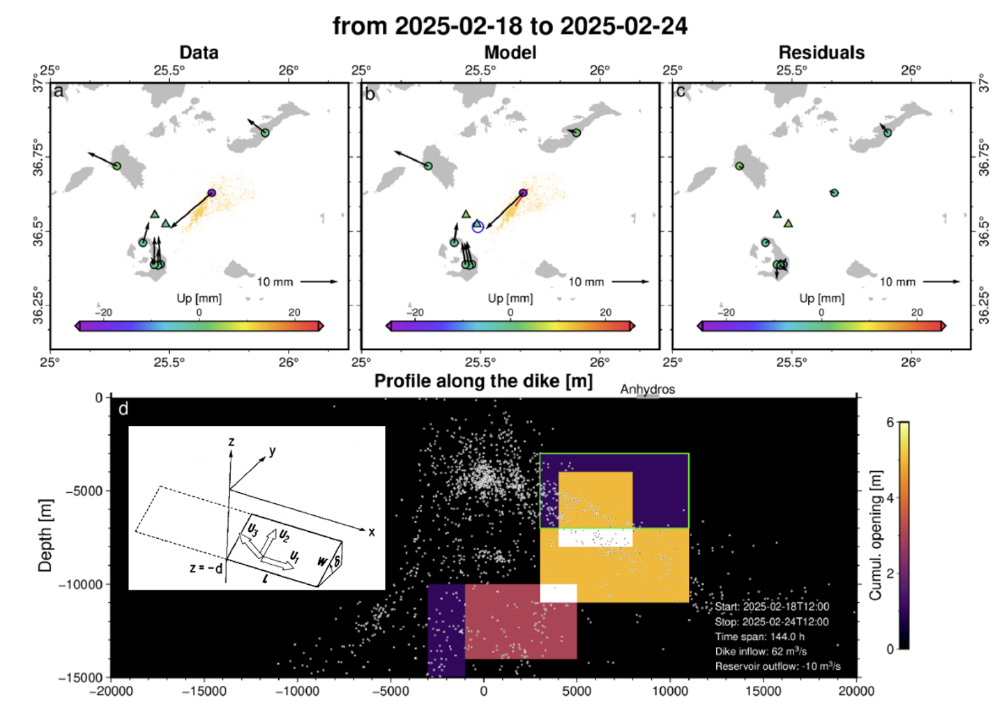 2 应用断层位错模型(d插图,来自Odaka, 1985)定量模拟岩墙膨胀造成的地表变形。Isken等针对圣托里尼东部的区域构造模式假设5个走向北东、垂直地面的岩墙(上图c)依次活动,成功模拟了地表变形观测(Isken et al., 2025