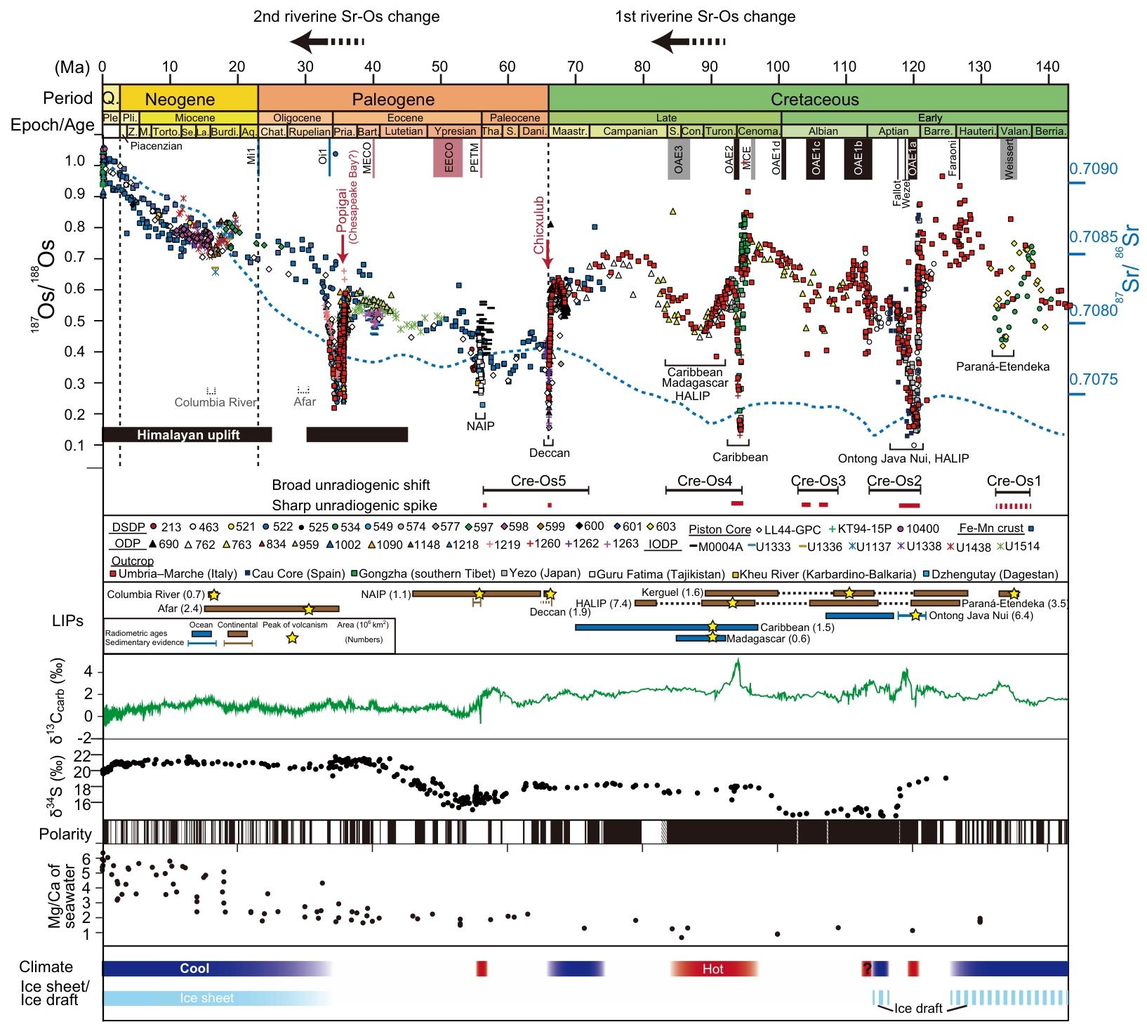 图2 过去 1.43 亿年海水Os-Sr同位素比值综合图。该图整合了海水 ¹⁸⁷Os/¹⁸⁸Os 和⁸⁷Sr/⁸⁸Sr 比值、大型火成岩省喷发时代与面积、碳-硫同位素数据、海水 Mg/Ca 比值、地磁极性以及全球气候事件等多维度信息