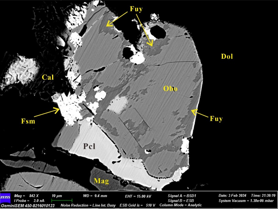 图1 背散射图像下的福元铌矿(Fuy),与鄂博铌矿(Obo)、烧绿石(Pcl)、铌钙矿(Fsm)、磁铁矿(Mag)、方解石(Cal)和白云石(共生)共生