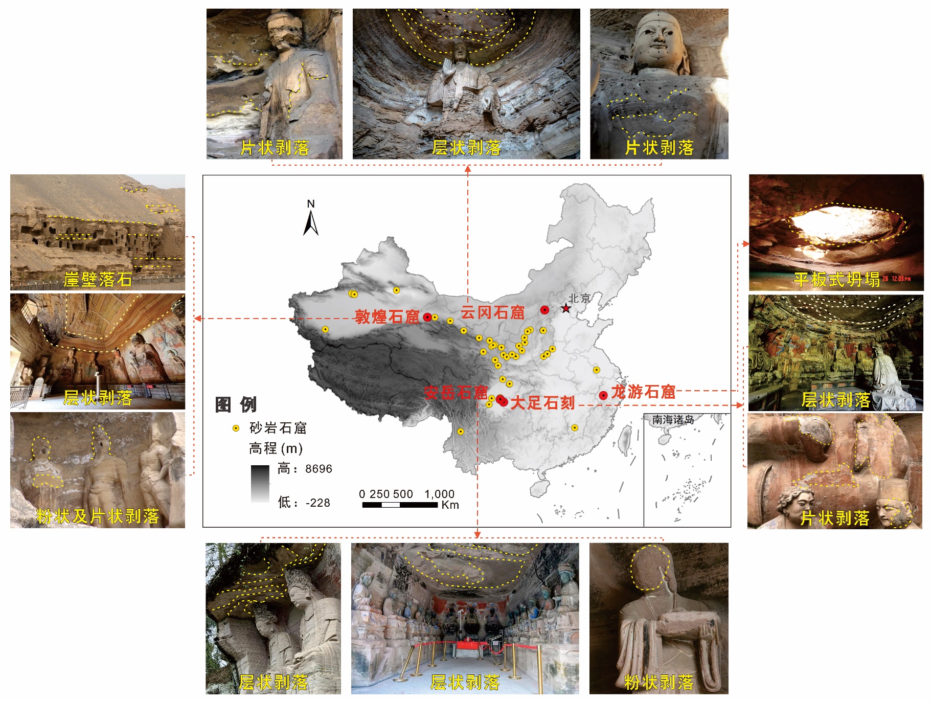 图1 我国典型砂岩石窟分布及劣化现象