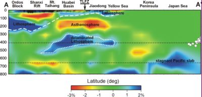 高分辨率的地震层析成像结果揭示了华北克拉通现今岩石圈结构细节:太行山以东、燕山以南的华北盆地、胶东半岛和渤海湾之下,岩石圈厚60-100km,表明岩石圈已显著减薄,而其周缘的太行山、燕山-辽西和辽东地区,岩石圈仍厚达100-150km。太行山以西的鄂尔多斯地块岩石圈厚230km左右。文章分析认为,华北克拉通东部岩石圈大规模伸展减薄(克拉通破坏),是晚侏罗-早白垩世以来其周缘不同板块多向汇聚构造背景下发生陆内俯冲和陆内造山的必然结果。