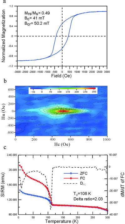 趋磁细菌“Candidatus Magnetococcus yuandaducum”的磁滞回线 (a), 一阶反转曲线图 (b) 和低温磁学性质 (c)