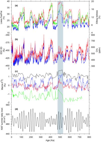 然而,我所新生代地质与环境研究室的郭正堂研究员等人最近对中国黄土、深海记录和南极冰芯最新资料的对比研究揭示出,80万年来南、北两半球气候在冰期-间冰期旋回上只是一种“大致耦合”关系,存在着一系列显著的“非耦合”特征,其中以深海氧同位素13期(MIS-13, 约50万年前)最为突出(Guo et al. Strong asymmetry of hemispheric climates during MIS-13 inferred from correlating China loess and Antarctica ice records. Climate of the Past, 2009, 5: 21-31,点击此处下载该文,2008IF:2.542)。