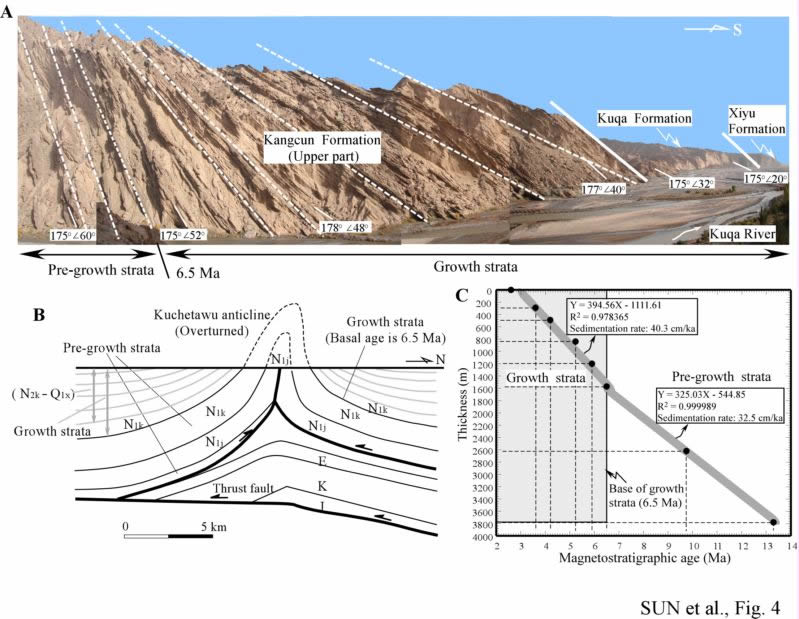 我所新生代地质与环境研究室孙继敏研究员等人对南天山库车前陆盆地秋里塔格背斜的构造变形时间进行了厘定,提出中新世末期至早更新世是天山山脉发生地壳缩短的重要地质时期,其成果最近刚刚发表在著名地学期刊Geology(Sun et al. Magnetostratigraphic data on Neogene growth folding in the foreland basin of the southern Tianshan Mountains. Geology, 2009, 37(11): 1051-1054,点击此处下载该文)。该工作在磁性地层学、生物地层学的基础上建立了厚达3800m的晚新生代地层的时间框架,在构造几何学基础上,识别出同构造沉积,确定了生长地层的起始年龄,结合磁组构的系统变化,指出南天山库车前陆盆地秋里塔格背斜的构造变形始于650万年,而且此次构造变形一直持续到早更新世末期。这一构造变形的发生时间与他们此前在昆仑山北缘及北天山前陆盆地报道的构造变形时间十分接近,说明中新世末期至早更新世是天山山脉发生地壳缩短的重要地质时期。