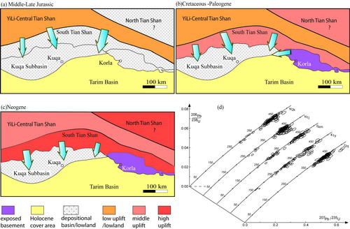 图2:根据多类沉积碎屑记录(碎屑锆石年代学记录见(d))和物源示踪信息重建的库车盆地-天山演化:(a)中-晚侏罗世, (b)白垩-古近纪, (c)新近纪.