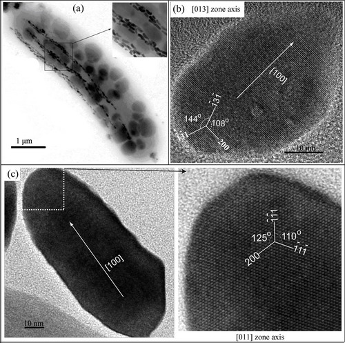 图(a)趋磁杆菌MYR-1及其磁小体链束;(b)和(c)分别为MYR-1磁小体沿磁铁矿晶体[013]和[011]晶带轴的高分辨透射电子显微镜图像