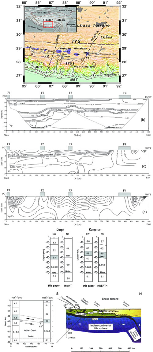 800彩票青藏高原研究室张忠杰研究员及其研究团队与美国斯坦福大学地球物理系Simon Klemperer教授合作,对该宽角地震资料进行了重新处理,构建了研究区2-D地壳纵波速度结构、横波速度结构以及波速比结构;结合研究区后续开展的INDEPTH和HIMNT等项目的研究成果,对壳内低速层(LVL)与主喜马拉雅冲断层(MHT)的关系、印度板块俯冲角度等问题进行了研究,取得如下认识: