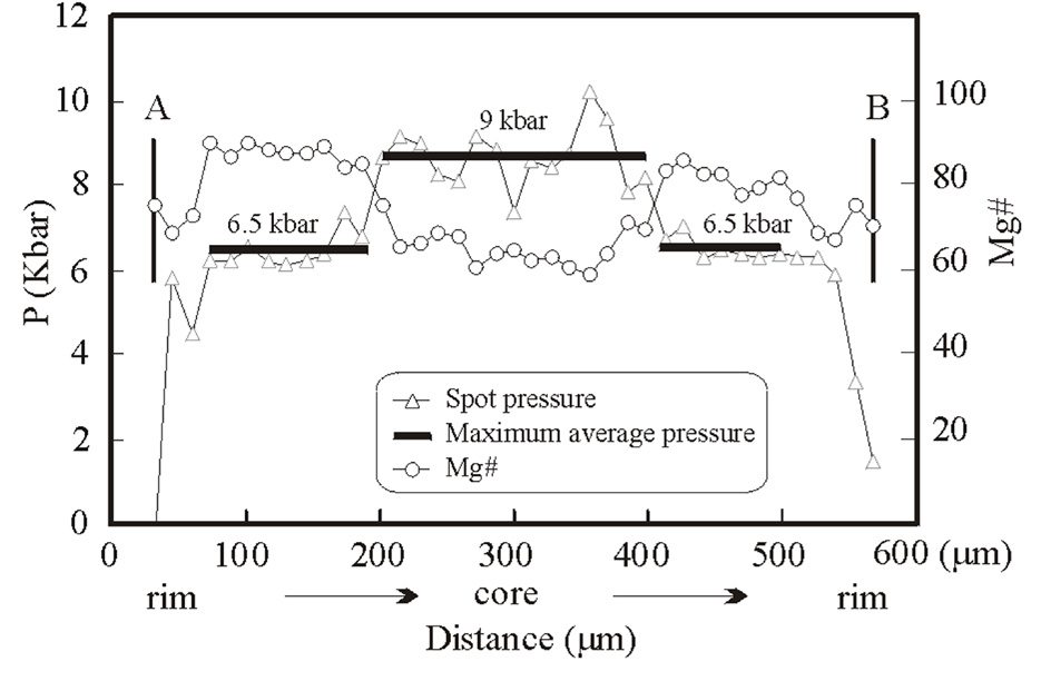 图2. 运用角闪石压力计估算岩浆与地幔橄榄岩反应(生成反环带角闪石的高Mg#的幔部)