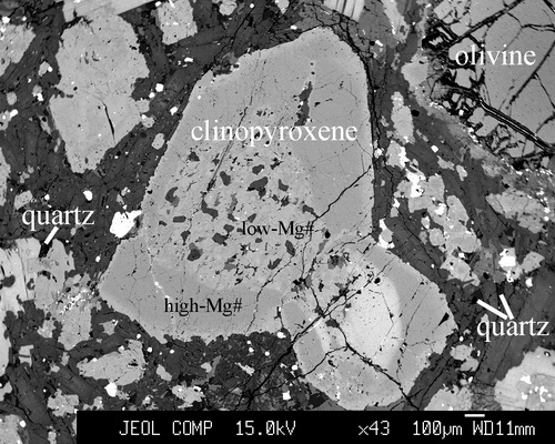 大量石英,辉石核部低Mg,含更长石、钾长石和黑云母包裹体,表明(1)初始岩浆为中酸