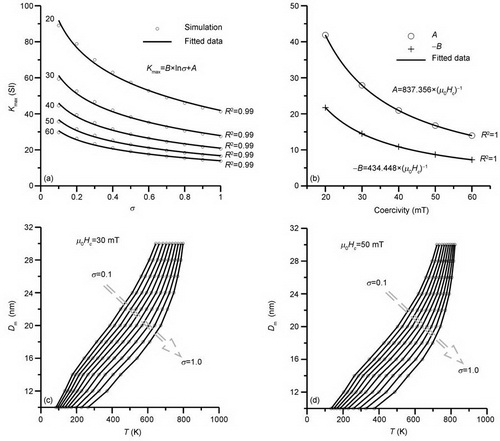 (a) 分布宽度σ与最大体积磁化率κmax的关系。圆圈为计算结果,实线是对计算结果的拟合曲线,曲线左侧的数字代表颗粒的矫顽力。二者具有对数关系,R2为判定系数;(b) 对数关系式中系数A、B与矫顽力μ0Hc的关系。拟合结果显示系数与矫顽力呈倒数关系;(c) (d)不同分布宽度的磁铁矿解阻温度与中值粒径的关系。分布宽度σ从0.1到1.0变化。