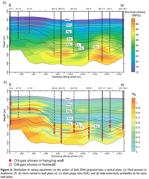 800彩票油气资源研究室博士后张立宽与合作导师罗晓容研究员等人选择我国大港油田埕北断阶带古近系内同沉积断层为研究对象,将断层两侧已聚集的油气或油气显示作为判识断层在油气运移时期是否开启的依据;按照一定的密度在断层面上逐点进行启闭特征分析,提出连通概率的概念,建立起了量化描述断层启闭性特征的全新方法。他们通过归纳分析,将影响断层启闭性的主要因素归结为泥岩流体压力、断面正应力和泥岩涂抹三个代表性参数,依据其影响断层启闭性的机理构建出一个无量刚数断层启闭系数。在此基础上,选取横切断层的典型油气藏剖面,计算断面不同位置处的启闭系数,根据其上下两盘储层内是否含油来确定其“开启”或“封闭”性质。通过概率统计分析,建立了断层启闭系数与断层连通概率间的相关关系:当断层启闭系数小于1时,断层连通概率为0;启闭系数为1~3.5时,二者关系可表达为一个二次多项式;当启闭系数大于3.5时,断层连通概率为100%。由此在拓扑展开的断层面上勾绘出连通概率等值线图,展现出了断层面不同位置处的启闭性特征。