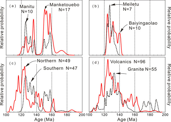 800彩票岩石圈演化研究室博士后张吉衡等人使用LA-ICPMS锆石U-Pb及全岩40Ar/39Ar定年方法对中南部火山岩进行了系统的年代学研究。结果表明满克头鄂博组的形成时代包括晚侏罗世和早白垩世两期,时代范围分别为160Ma-150Ma和136Ma-122Ma;玛尼吐组的年龄范围为158Ma-125Ma,同样可以分为晚侏罗世和早白垩世两期(158Ma-150Ma与137Ma-125Ma)。白音高老组和梅勒图组火山岩则全部形成于早白垩世期间(141Ma-124Ma)。结合已有的年代学数据表明,大兴安岭中南段中生代火山岩主体形成于晚侏罗世-早白垩世期间,介于160Ma到122Ma之间,并且可以分为两个阶段:160Ma-150Ma与141Ma-122Ma,在这两个阶段之间有一个明显的间断(大约10Ma;图1)。