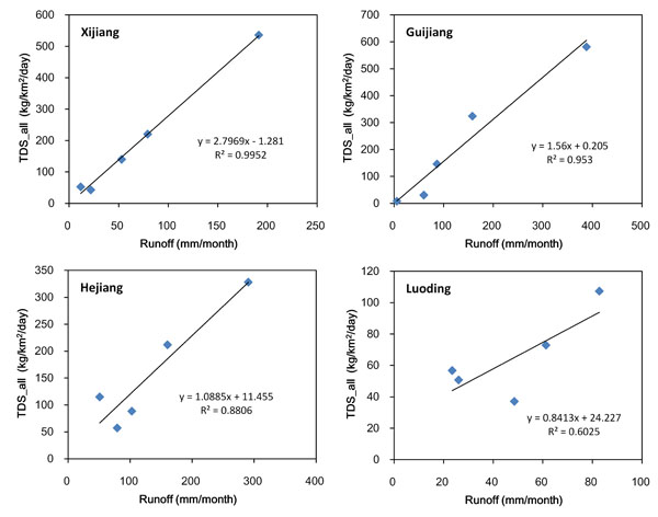 研究发现,西江河流碳以DIC为主,其来源主要为流域岩石化学风化。岩石化学风化过程需要消耗大气CO2,从而在地质时间尺度上,对大气CO2浓度与地球表面温度进行负反馈调节。认识岩石化学风化的主要影响因素,对于评估未来气候变化规律具有重要意义。然而这一问题目前还存在争议,有的研究认为化学风化速率主要与降雨有关,而有的则认为主要与温度有关,也有研究强调其它因素如坡度(构造抬升)、水-岩接触时间等。孙会国等人通过系统的时空采样,对西江流域岩石化学风化过程与环境因子的作用机理进行了深入分析,证实无论是硅酸盐还是碳酸盐风化都主要受控于降雨(图2),同时大气温度升高可以有效提高岩石风化速率。