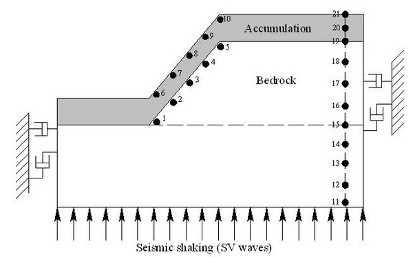 离散元方法的基本出发点是将材料视为非连续,所以尤其适合于堆积层斜坡这种颗粒材料的计算模拟。800彩票工程地质与水资源研究室博士后赫建明等人采用了颗粒流来模拟覆盖于基岩层之上的堆积层斜坡动力响应问题。数值模型的建立基于堆积层斜坡现场地质调查结果之上并进行了适当的简化处理,模型地震波输入波形采用了汶川地震所记录水平剪切波形。他们对模型中不同位置处特别是基岩与堆积层的交界基覆面附近的动力响应进行了相关研究。对基岩层中以及堆积层中的各个监测点数据进行比较分析发现,在基岩层中的各个不同标高位置处的速度及位移波形图总体来说呈同步发展态势。而与之相反的是,在堆积层中不同位置处的速度及位移波形图则变化显著,堆积层中不同位置处的速度波形有时甚至呈反相发展,而位移波形在幅值上相差很大。