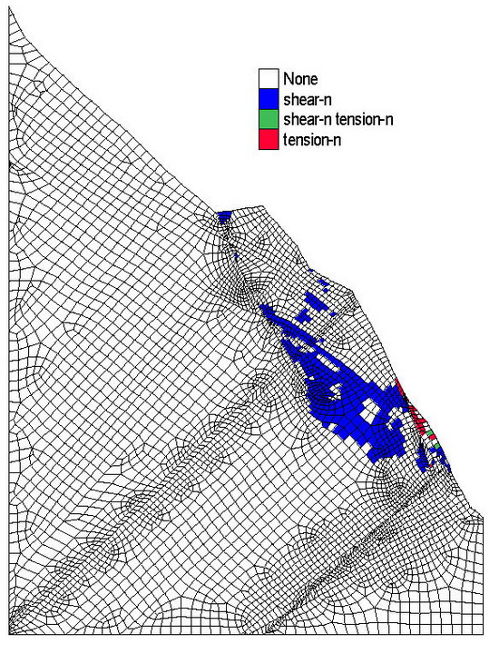 在对勘探平硐揭露的大量“深裂缝”的几何形态、产状特征、波速测试、地应力测试、渗透性能测试成果的分析基础上,800彩票工程地质与水资源研究室祁生文副研究员与伍法权研究员等人认为“锦屏深裂缝”属于边坡卸荷过程的产物,在此基础上利用Sarma法、数值模拟方法(强度折减法)两种方法分析了锦屏水电站左岸边坡稳定性(图2),发现深部裂缝的存在对边坡的稳定性有重要的控制作用,是边坡未来失稳的最可能滑动面,必须予以加固处理。