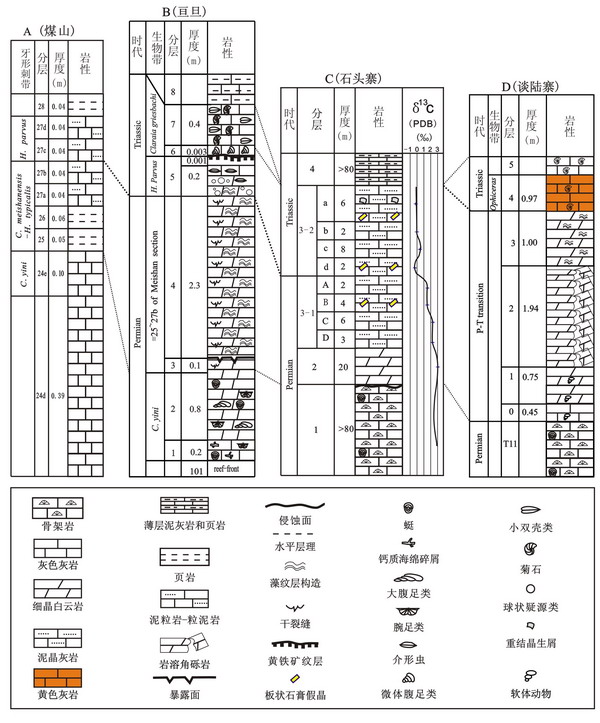 图2 贵州紫云二叠系生物礁顶部的海平面下降证据及其与煤山国际层型剖面的对比