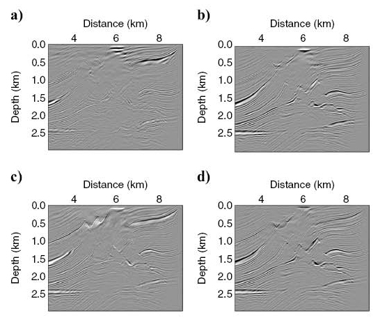 附图说明:Marmous模型偏移结果。a) SSF(最小速度);b) SSF(平均速度);c) GS(最小速度);d) GS(平均速度)。