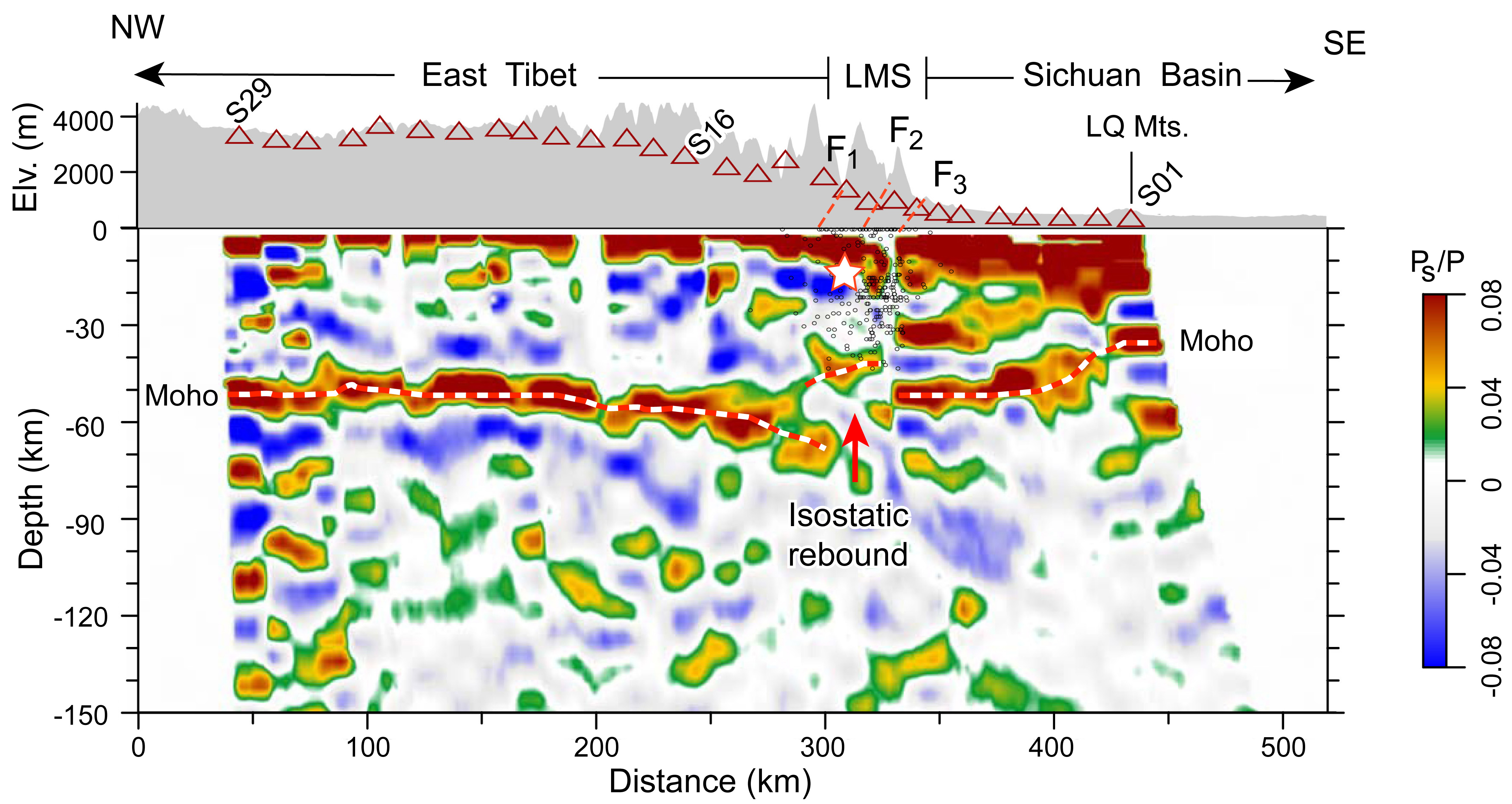 因此,他们提出类似汶川地震的巨大地震长期产生累积的同震构造变形及滑坡,泥石流等引起的快速侵蚀所引起的地壳均衡反弹的共同作用可能是青藏高原东缘晚新生代快速隆升的重要机制之一(图 1),这一新机制得到地球物理证据的有力支持(图2)。