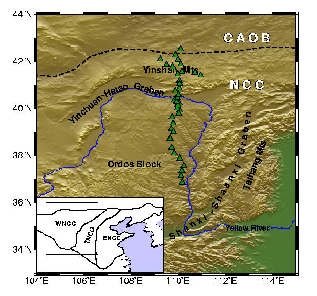 早期研究表明华北克拉通东部晚中生代到新生代经历了岩石圈的破坏(减薄),然而克拉通西部具有负的布格异常、低的地热流值,标志着华北克拉通西部仍然是稳定的,特别是鄂尔多斯块体。克拉通西部由北部的阴山造山带和南部的鄂尔多斯块体组成。河套地堑位于鄂尔多斯块体和阴山造山带之间,目前沿北西北-南东南向拉张。地堑从渐新世开始发育,并伴随着鄂尔多斯块体北缘的抬升。然而,是什么样的动力机制使得地堑拉张的同时,稳定的鄂尔多斯块体北缘出现抬升,这一问题尚有待深入研究。