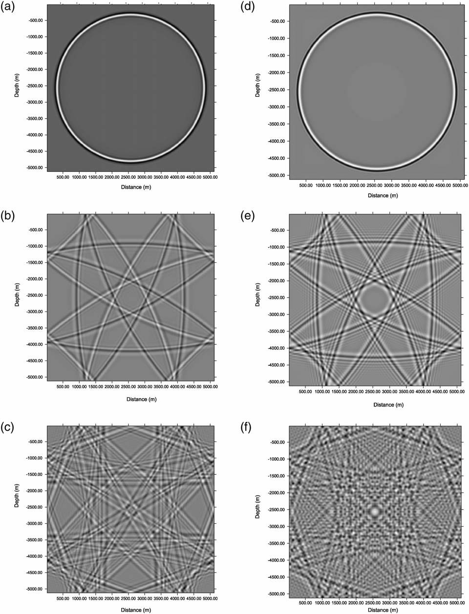 图1:不同波场模拟方法性能的比较:(a)MDSCD 的模拟结果;(b)伪谱法的模拟结果;(c)高阶有限差分法的模拟结果。