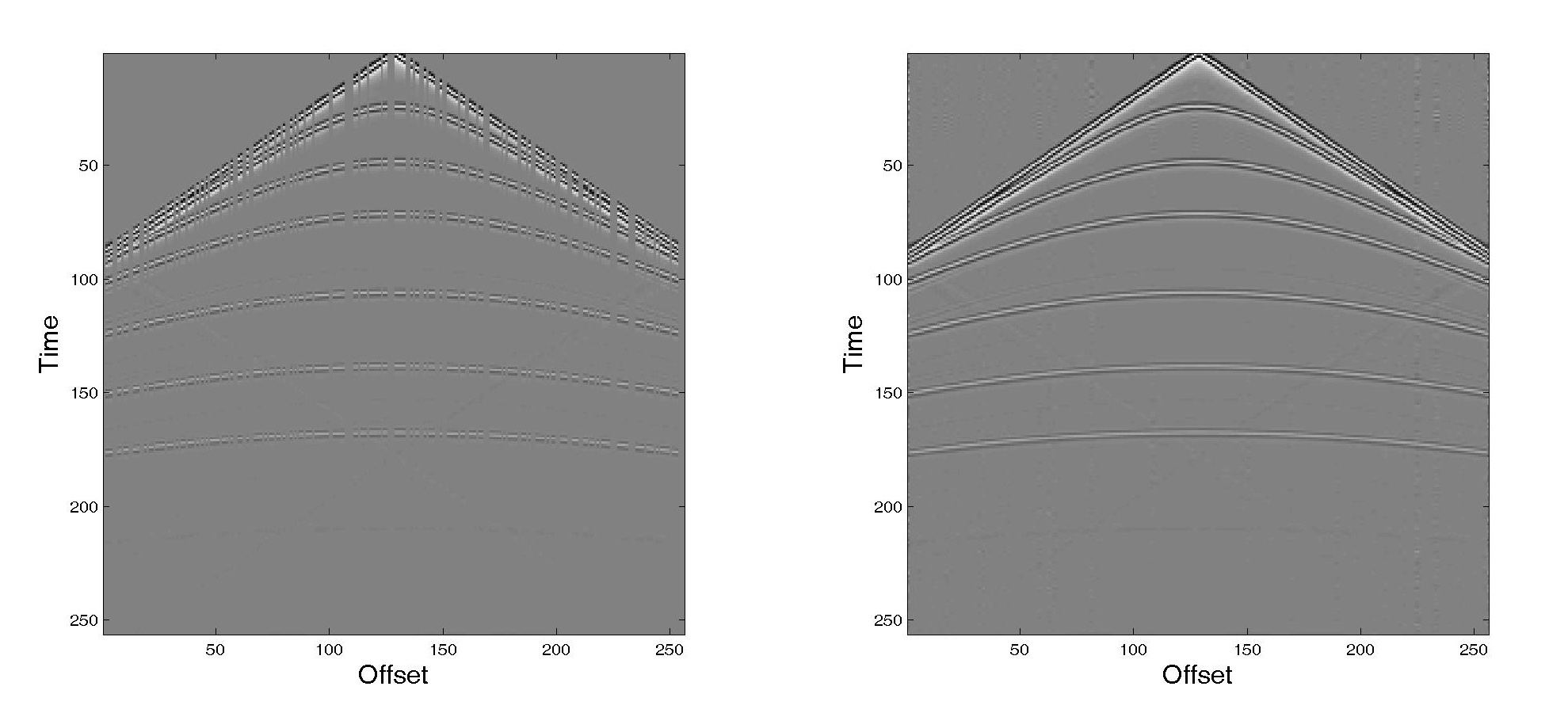 附图说明:左图为缺失的地震道数据;右图为由算法重构的地震波场数据