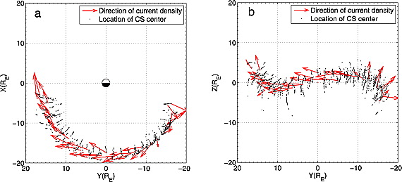 此外,他们还统计证实了磁场曲率半径Rc,min,中性片半厚度h及磁力线滑移角δ之间存在几何关系h= Rc,min cosδ。从观测上发现越尾电流密度方向(大小约4~8nA/m2)基本沿磁尾电流片切向方向由晨侧“西向”流向昏侧方向。