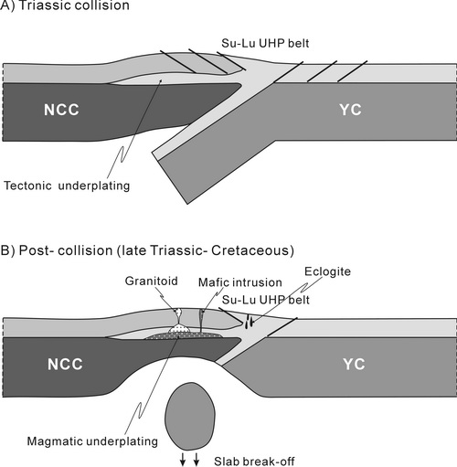 附图说明:华北东部中生代火成岩中新元古代锆石(物质)的来源与华北陆壳增厚的可能机制,A:华北与扬子陆块的碰撞(早三叠世)导致华北陆壳增厚;B:增厚后的减薄作用(晚三叠世以后)