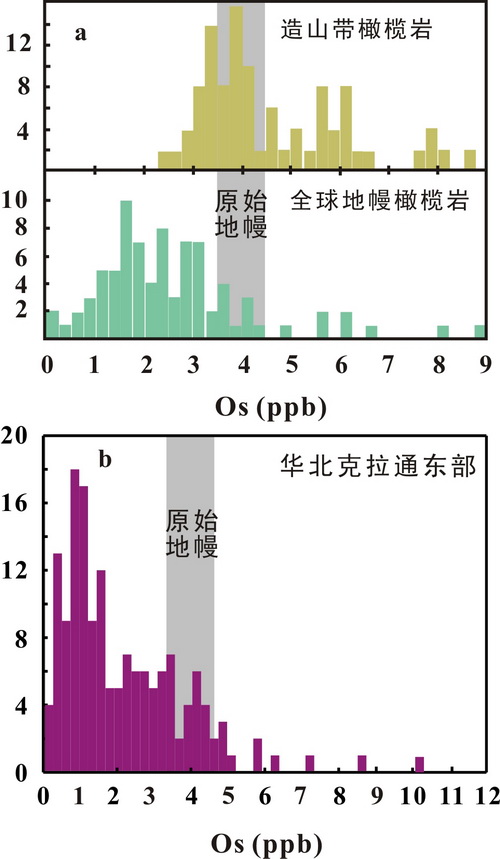 图2:郯庐断裂带内及以东地区橄榄岩的Os含量的柱状图