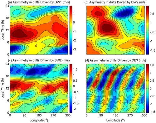 图注说明:DW1 (a)、DW2(b)、SW2(c)和DE3(d)潮汐驱动的赤道区垂直等离子体漂移春秋分不对称的地方时和经度变化