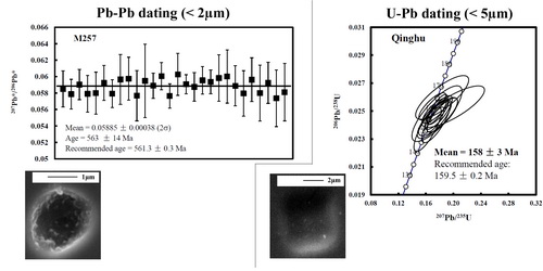 图注说明:左图显示锆石标准M257的Pb-Pb定年结果,右图显示锆石标准Qinghu的U-Pb定年结果。