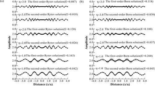 图2:高斯起伏地形对垂直入射SH波的振幅响应一阶、二阶Rytov (a) 与Born (b) 近似解对比。无量纲频率h分别为1.0,2.0和3.0,E为均方根误差,实线为精确解,离散点为近似解。此例中各阶Rytov近似解精度均高于Born近似解,且近似解精度随h增大而逐渐提高。