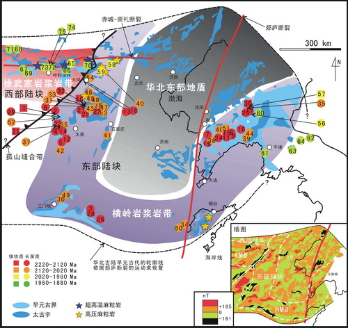 图1:22.2-18.8亿年岩浆岩在华北古陆上的分布及岩浆岩带的划分