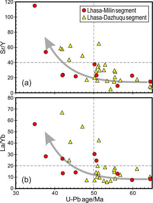 图1:随岩石年龄变年轻,其Sr/Y和La/Yb比值逐渐增加,反映了地壳增厚过程的发生。