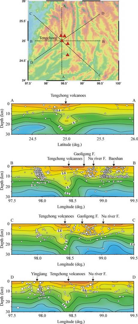 图1:沿不同方向穿过腾冲火山区的P波速度剖面,揭示了火山区下方低速体的深度和横向范围以及地壳结构的横向变化。