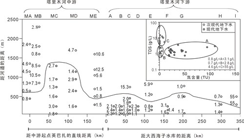 图2:塔里木河中下游河岸地下水盐度(TDS)分布,图中实线是现代水和次现代水的分界线。