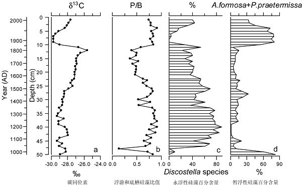 800彩票新生代地质与环境研究室古生态学科组的旺罗副研究员及其合作者的研究显示,在北方,由冰冻期长短控制的湖泊生物生长期,引起生活在不同水动力条件下的底栖和浮游硅藻相对含量的变化,是控制湖泊有机碳同位素变化的重要因素之一。该研究利用不同藻类所代表的水体动力条件与同位素分馏的关系,阐释了藻类组合的变化对有机碳同位素控制作用的机理。他们的研究发现中世纪暖期和20世纪暖期,由于冰冻期短,生长期长,代表生长环境水动力较强的浮游硅藻占绝对优势,碳同位素值低;在小冰期,由于冰冻期长,生长期短,生长于水下,代表水动力条件相对较弱的底栖硅藻相对含量较高,碳同位素值相对较高。温暖期内部浮游硅藻占优势的时期,生活在不同水动力条件下的不同浮游硅藻组合的变化,也会导致碳同位素的显著差异。