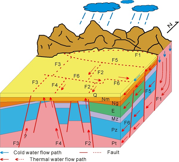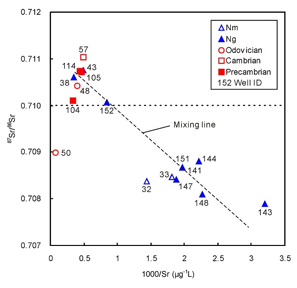 前新生代碳酸盐岩地层咸水87Sr/86Sr值多高于0.710,新近系砂岩地层咸水87Sr/86Sr值低于0.710。断裂附近,前新生代和新近系地层咸水发生混合,指示断裂附近穿层流的存在。