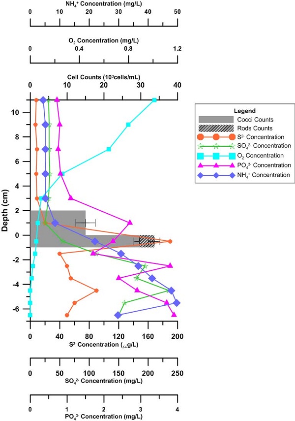 图1  沉积物中S2-, SO42-, O2, PO43-, NH4+浓度和趋磁细菌随深度变化