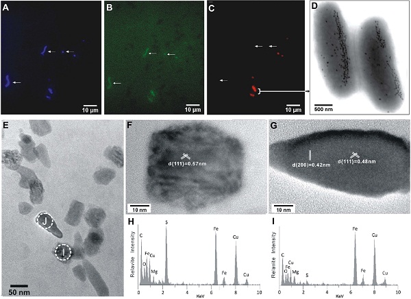 图2  同时合成胶黄铁矿和磁铁矿磁小体趋磁杆菌的荧光原位杂交、高分辨透射电镜及能谱分析结果
