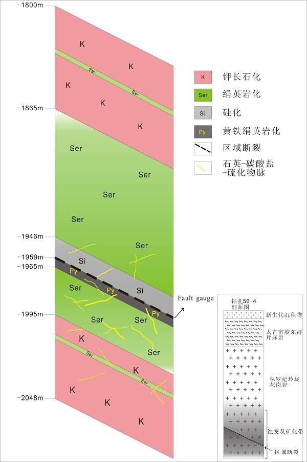 图1 三山岛金矿56-4钻孔揭露的蚀变及矿化分带示意图