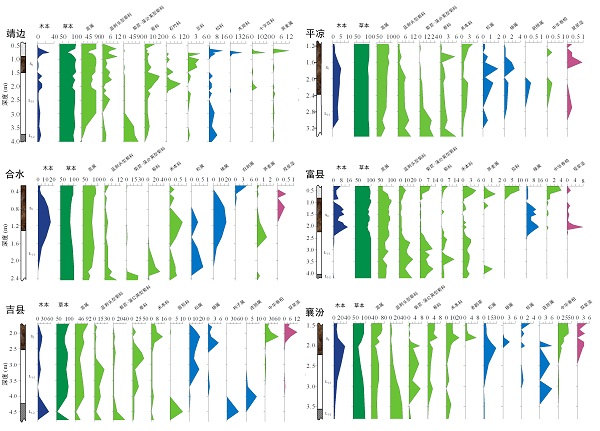 图2 靖边、平凉、合水、富县、吉县和襄汾剖面的地层和主要孢粉类型的百分比含量