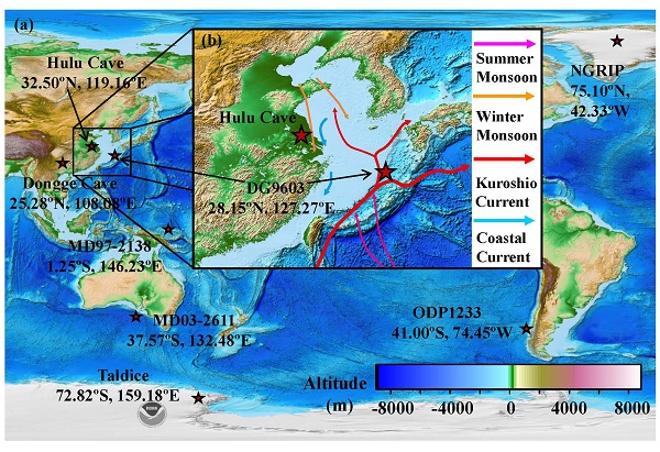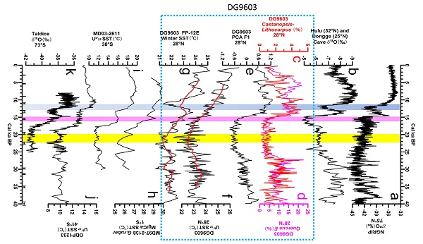 进一步研究认为,约2万年前,随着地球轨道岁差周期变化,北半球低纬度地区太阳辐射增加,热带海洋接收更多热量,信风增强,加速了自东向西的赤道暖流,造成西太平洋暖池变暖。在西太平洋暖池北部,变暖的海水通过黑潮暖流迅速向北运动,导致东海-冲绳海槽区域海洋约2~1.9万年前迅速升温;与此同时,在西太平洋暖池南部,温暖的海水穿越印度洋,通过厄加勒斯海流进入大西洋,增强大西洋经向翻转环流(AMOC)强度,向西北大西洋输送更多热量,随同北半球同时增大的夏季太阳辐射一起,加速融化北半球高纬度冰盖,引起大量淡水在约1.9万年前后开始涌入北大西洋,导致大西洋经向翻转环流(AMOC)减弱并在距今1.8~1.5万年期间几乎完全停止,造成北半球高纬度地区迅速变冷,并发展成北半球广泛存在的寒冷事件(Heinrich事件1,简称H1)。正是这次突然变冷的气候事件(H1)推迟了北半球陆地气候转暖的时间,导致了东亚陆地气候转暖滞后于东海海洋(西太平洋暖池)转暖约3~4千年。