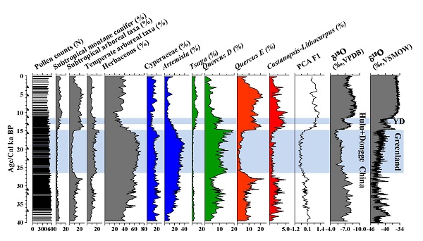 吕厚远学科组利用东海冲绳海槽DG9603钻孔的孢粉(提供陆地气候变化信息)、有孔虫和长链烯酮(提供海洋气候变化信息)分析结果,在相同的时间标尺上,分别建立4万年来陆地和海洋气候变化序列。结果显示,孢粉记录的陆地植被变化表明,陆地气候在距今约1.5万年前突然升温,在距今约1.29~1.15万年期间短期降温,这个变化模式与北半球高纬度格陵兰地区气候变暖过程是一致的(图1、2)。然而,有孔虫和长链烯酮生物温标记录的海水温度变化显示,东海冲绳海槽区海水温度早在约2~1.9万年前就迅速升温,一直到全新世温暖期,这个变化模式与低纬度西太平洋暖池变暖过程是一致的。由于该研究所分析的陆地、海洋指标来自同一钻孔,避免了年代对比的不确定性,因此分析结果准确地揭示了末次冰消期东亚地区海洋变暖超前陆地气候变暖约3~4千年(图3)。